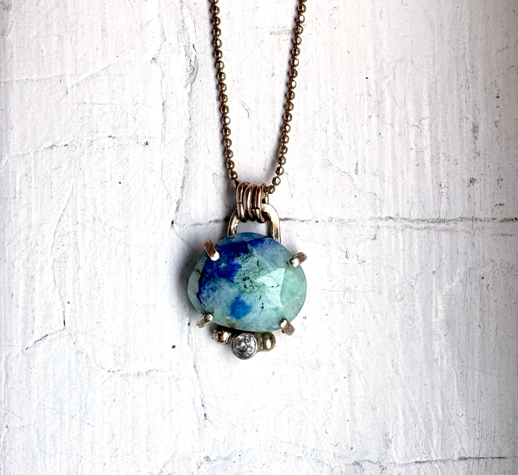 A wonderful blue and green rose cut Afghanite is set in a handmade 14k prong setting that I made from scratch. A small recycled white diamond is set in a bezel at the bottom, flanked by two gold pebbles. It hangs from 3 gold oval jump rings on a 16" 14k gold diamond cut bead chain.