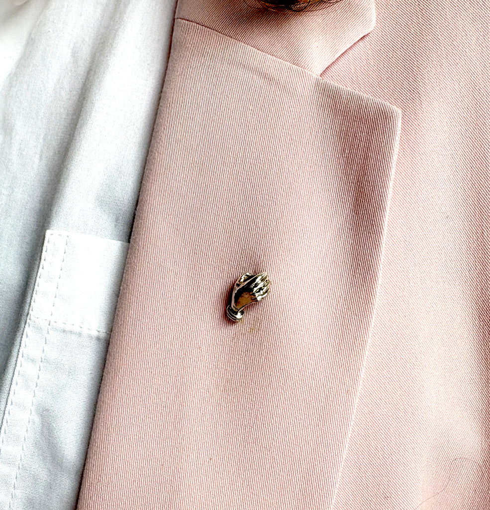 I took this hand from a vintage ring design, and re-worked it into a lapel pin! A sterling silver bar bridges the back of the fingers, allowing it to hold onto a little spring of flowers for the perfect boutonniere or brooch or lapel pin. A tie tack and and flat clutch completes it on the back. A tiny pin with a big impact!