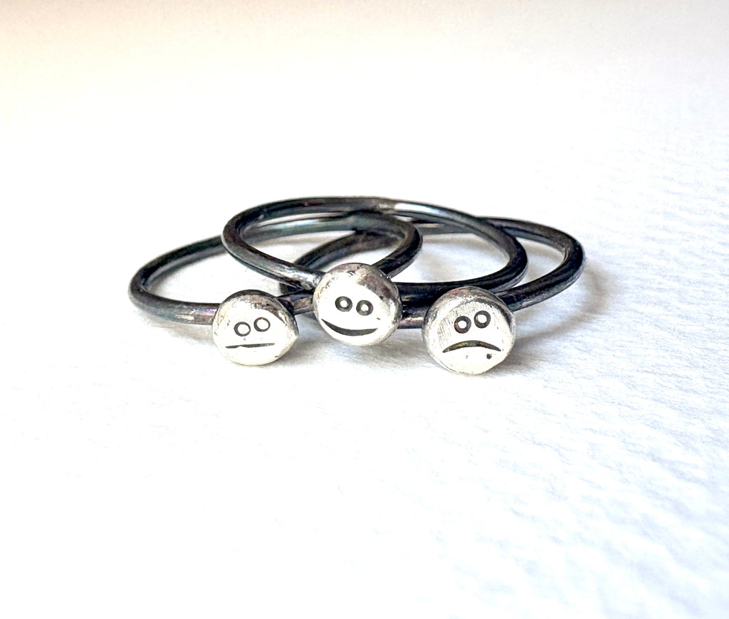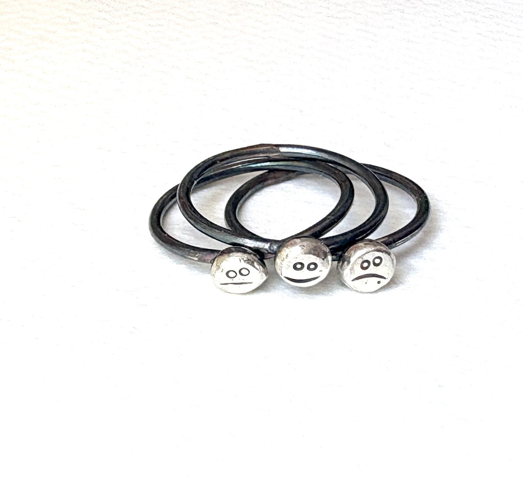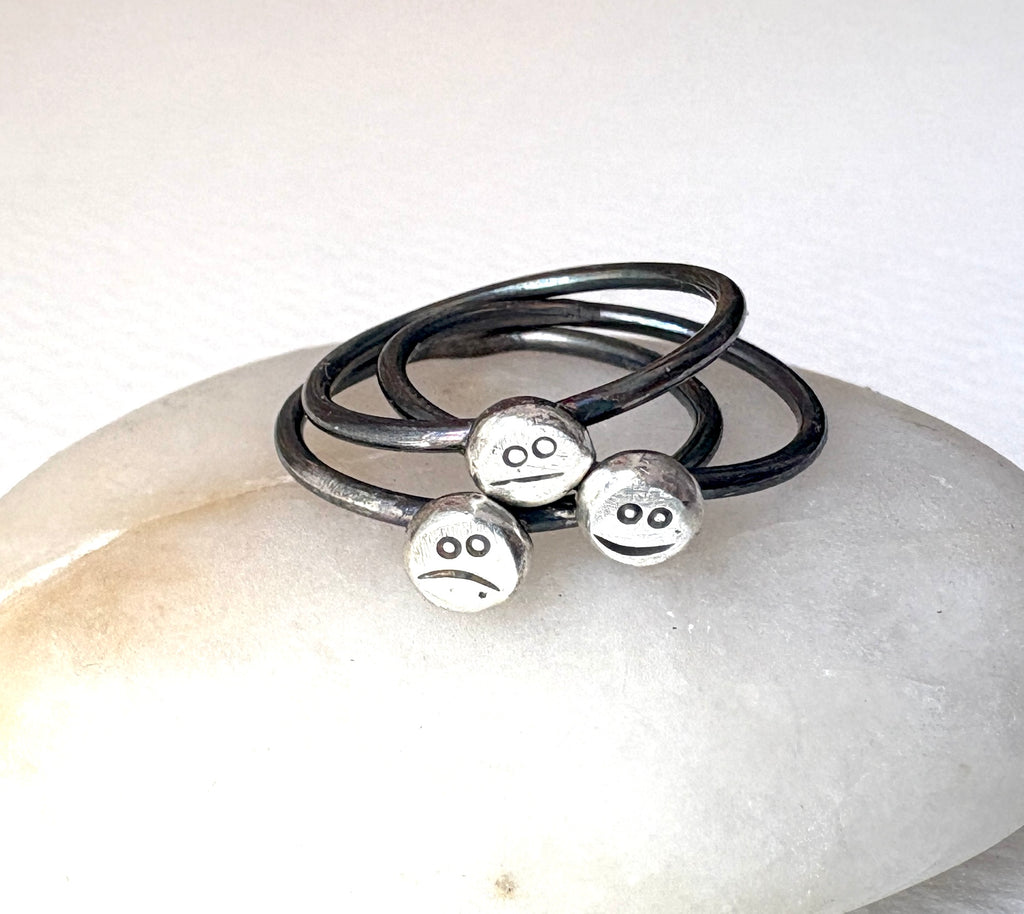 I thought of these rings while my mind wandered in yoga class. Three stacking faces, one happy, one sad, one med. wear them together or alone. change the order. rub them for good luck! The band is oxidized black and the faces are shiny silver. Handmade.