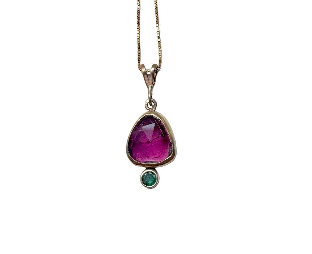 A glowing pink triangular tourmaline is set in an open back 14k gold bezel, with a sterling silver rimmed back. A bright 4mm emerald sits in a 14k gold tube bezel, and it hangs on a split bale, on an 18" shiny 14k gold box chain. Dainty and sparkly, and one of a kind!