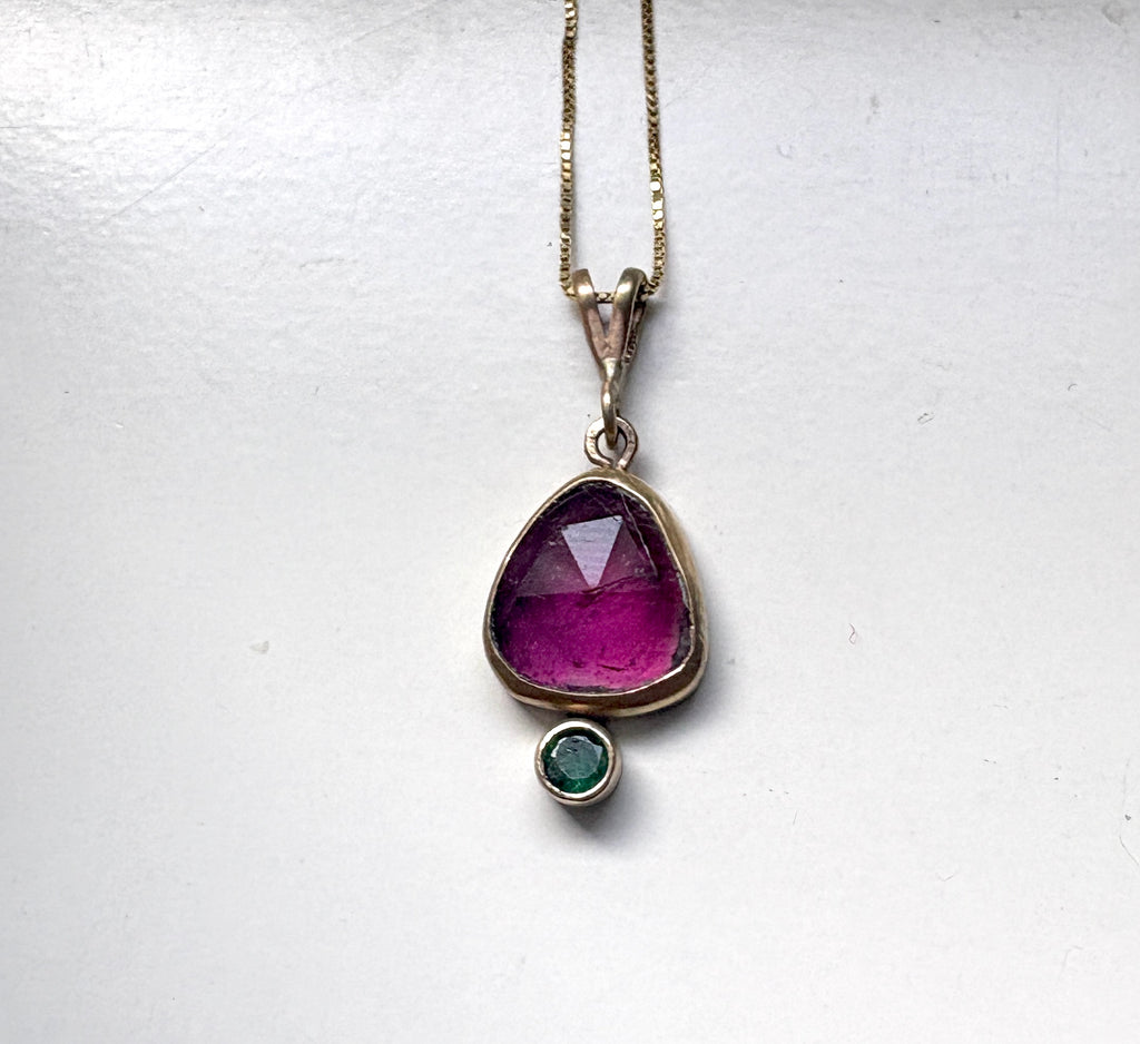 Pink and Green 14k Gold Pendant with tourmaline and emerald