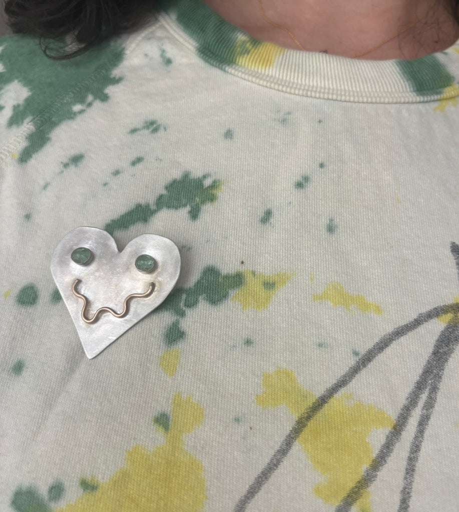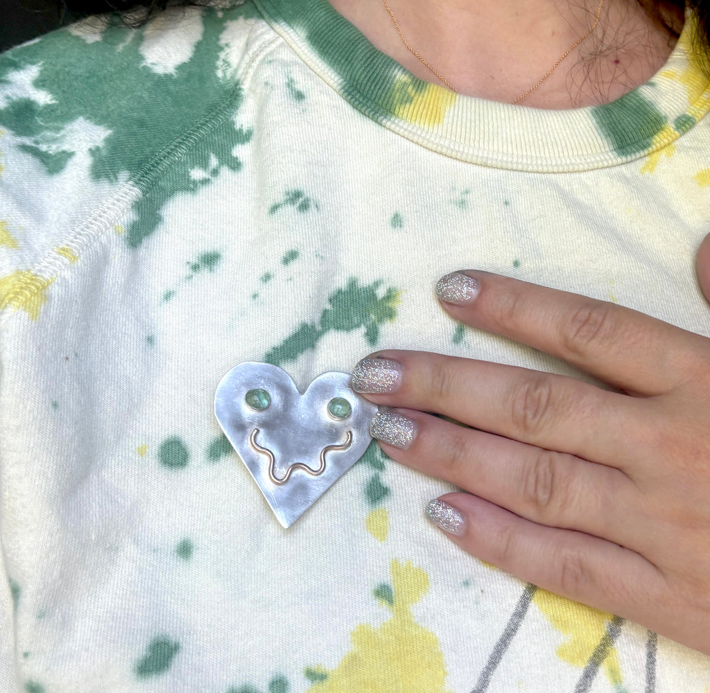 This is definitely one of my favorite things in a long time. Handcut out of a vintage sterling silver tray, I turned him into a wiggly smiles emerald eye'd heart friend. A wiggly smile made of 14k gold-filled wire is the cherry on top. I soldered a stainless steel pin back to the back. A hefty, sturdy pin that is perfect for heavier shirts, sweater or jackets!