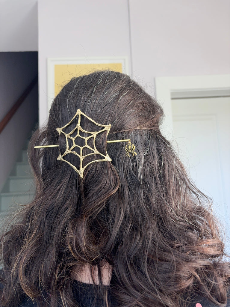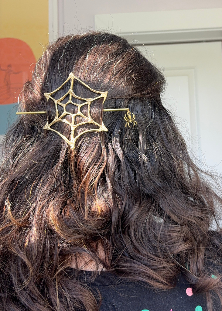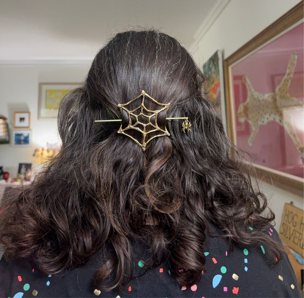 A seasonal hair slide! made in wax by me and cast in shiny solid recycled brass with a hair stick also made by me and a cute little bronze spider hanging from it. simple twist hair back, place spiderweb over with the curved sides going down, and slide pin through the side that bends down, under hair, and up through the other opening!