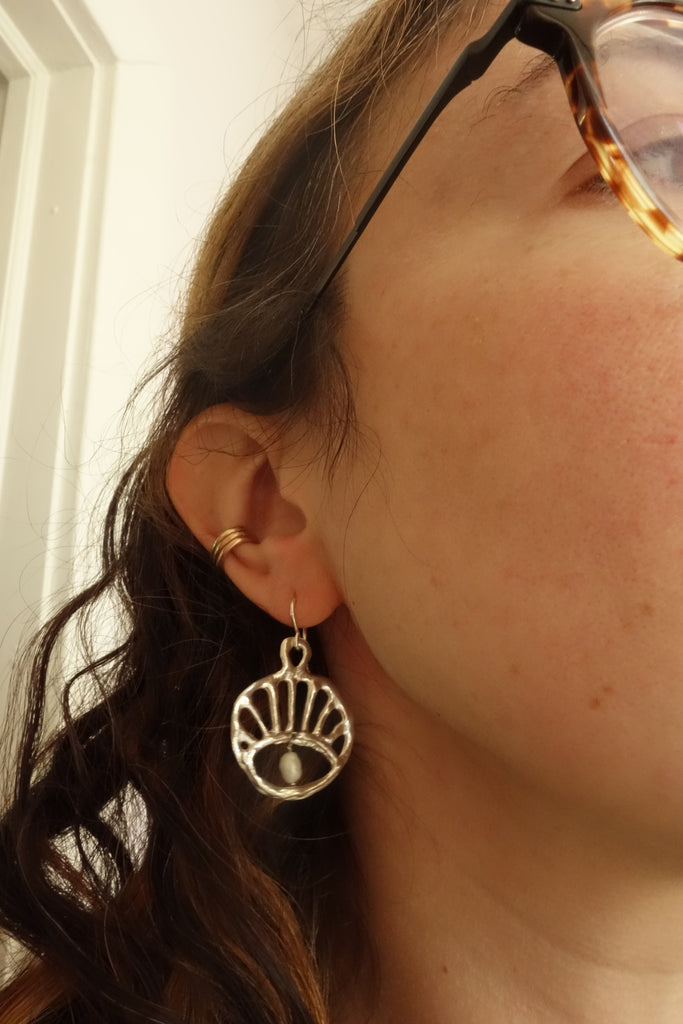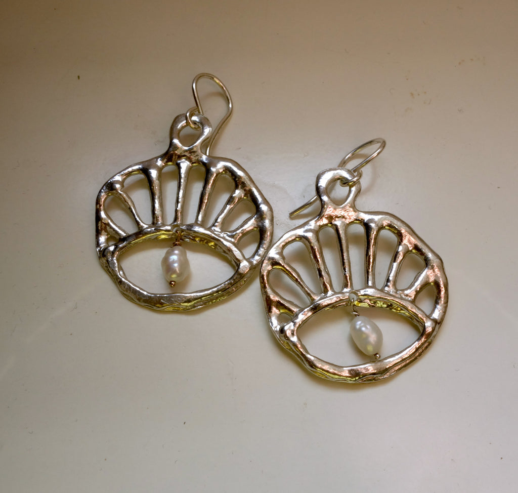 I made these in wax and cast them in solid sterling silver, and dangled little rice pearls from the insides! They hang on sterling silver ear wires.